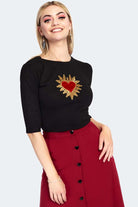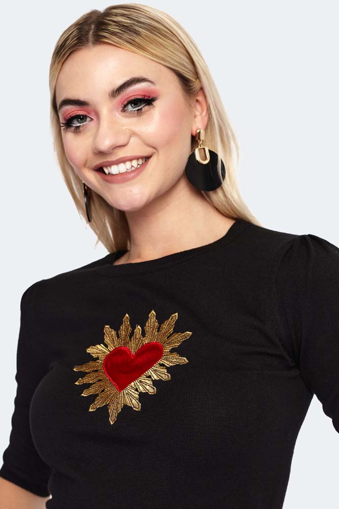 3/4 sleeve black knitted round neck sweater with opulent heart embroidery patch.