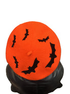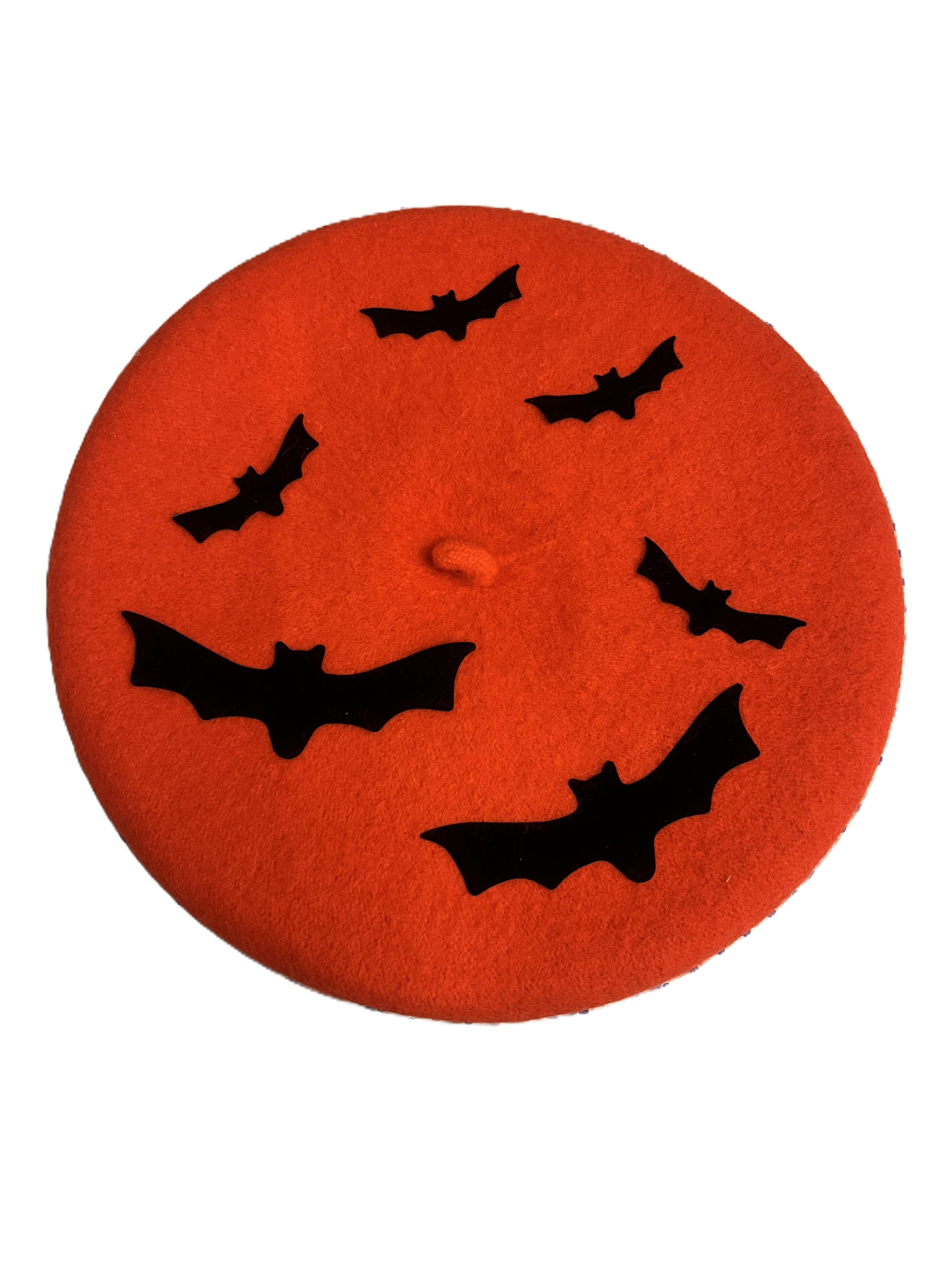 Add some fun to your fall wardrobe with this orange wool beret, playfully decorated with flocked bats by Betty.