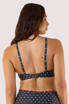 Unleash bold pin-up charm with the Dottie Polka Dot Scallop Underwired Plunge Top. Tailored for fuller busts, this striking black polka dot bikini boasts supportive underwired cups and a daring red scalloped edge that commands attention. With adjustable shoulder straps and a secure clip-back closure, it marries fearless style with flawless fit—a retro-inspired showstopper ready to ignite your vintage summer confidence.