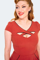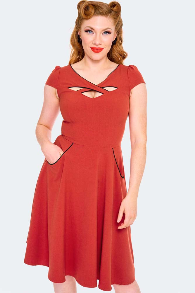 50s style A line cross neck detail above the knee dress with a contrast trim. Featuring a keyhole crossover neckline, contrast black trim, short sleeves and side pockets