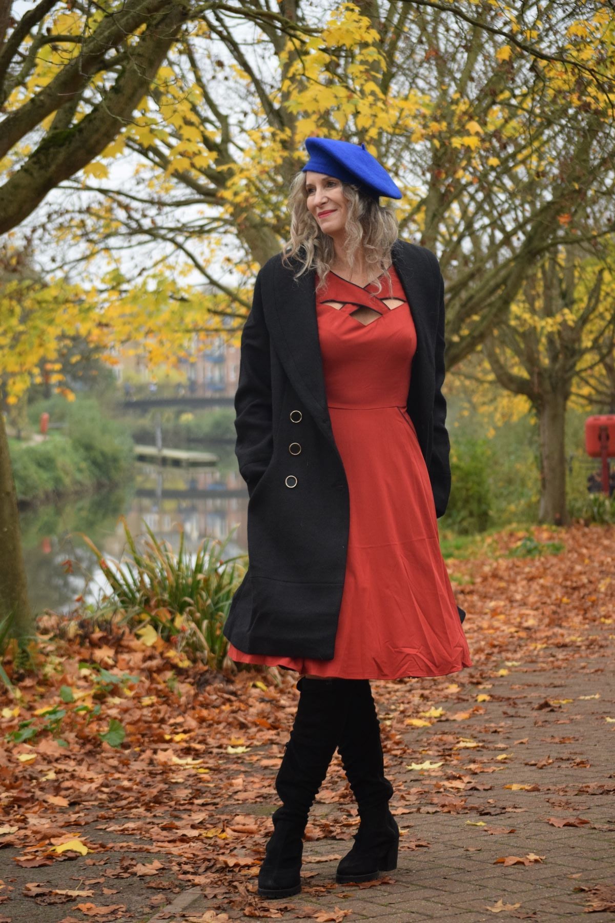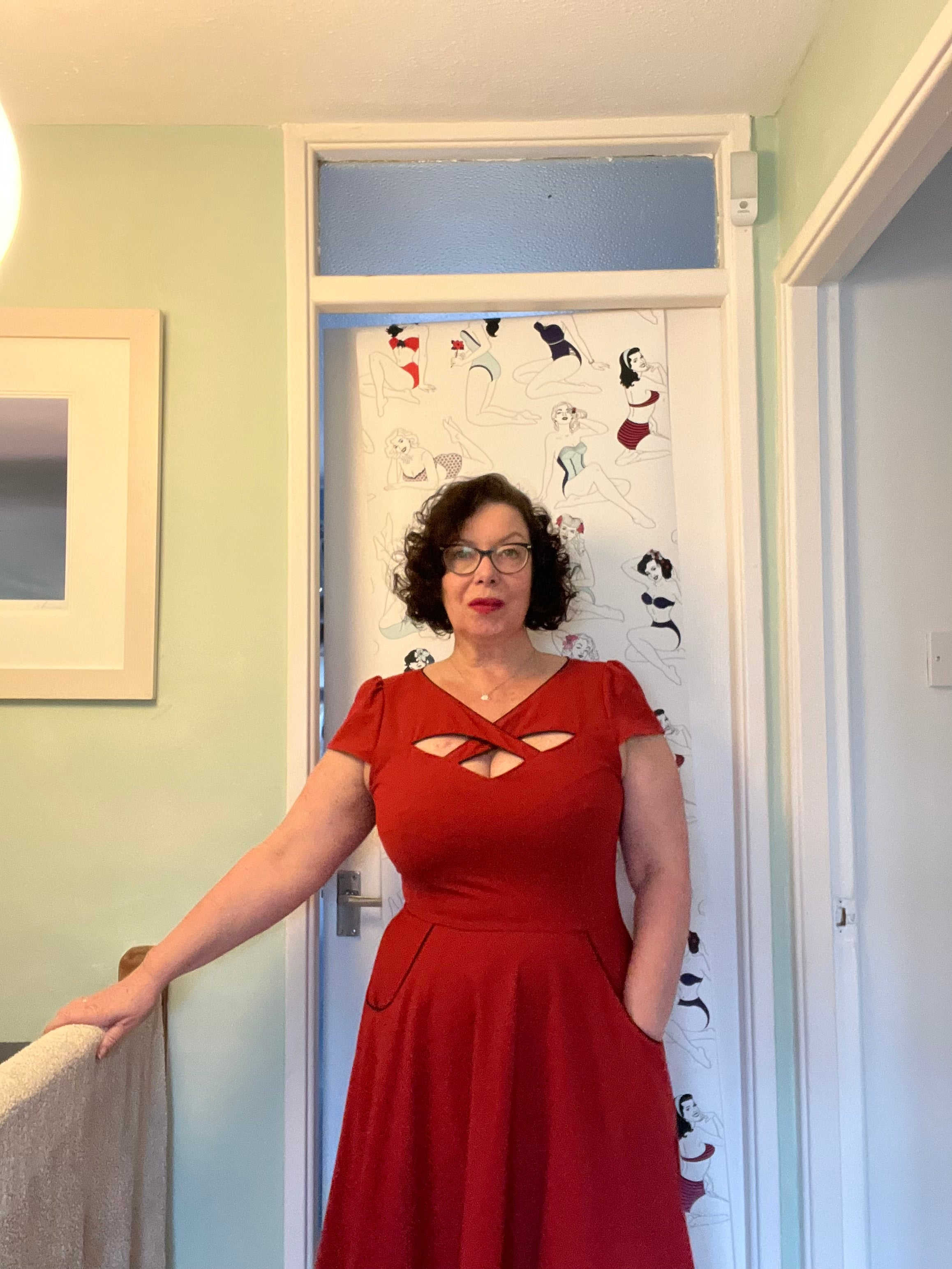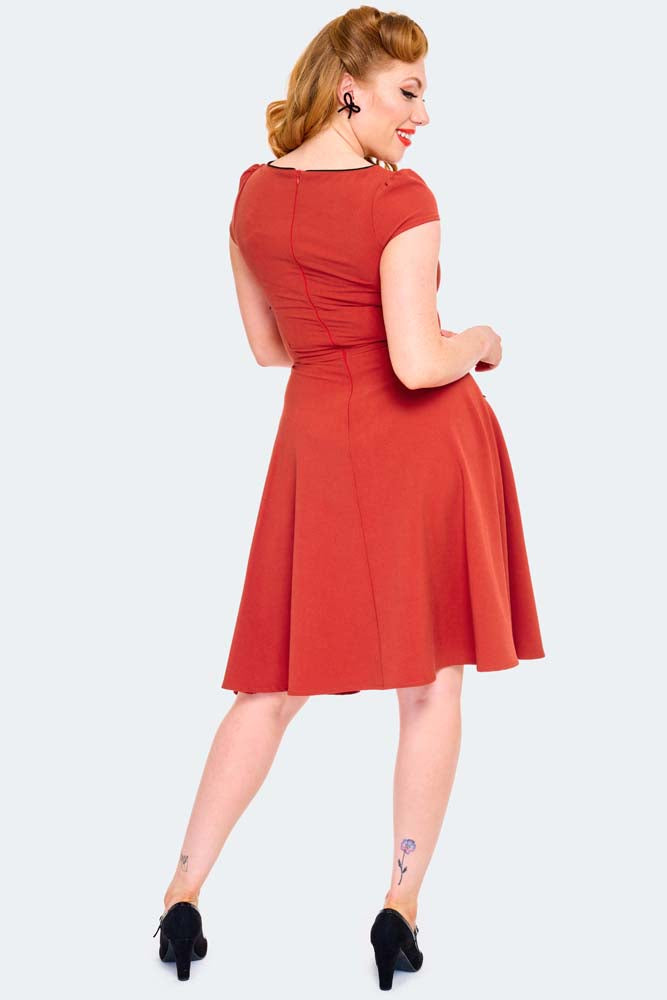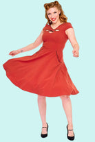 Red retro dress with a cheeky cross-front detail and flattering flare. Pure vintage fun.