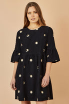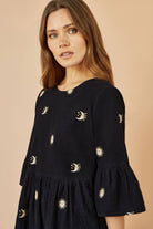 This lovely tunic is crafted from 100% cotton cord. The 3/4 flared sleeves add to the whimsical feeling of this dress. With an all over star and moon celestial print that is embroidered. Add tights and boots to create a perfect everyday look.