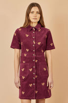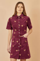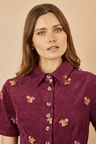 Yumi Burgundy Cord Shirt Dress With All Over Squirrel Embroidery