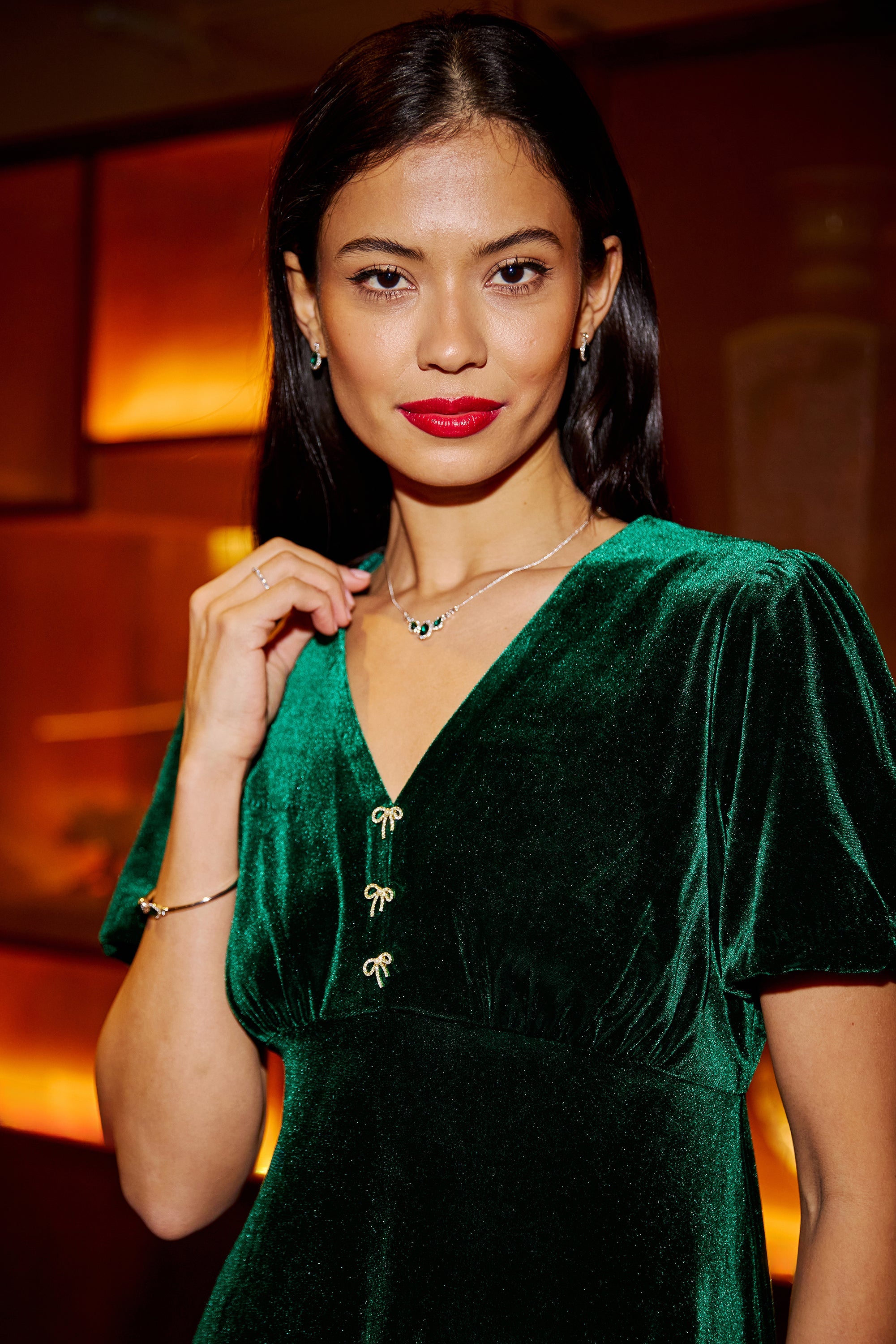 Turn up the glamour this party season in gorgeous luxurious velvet. This skater style is perfect for the Christmas party, with cute puff sleeves and diamante bow details adorning the bodice. An easy and relaxed fit for everyone.